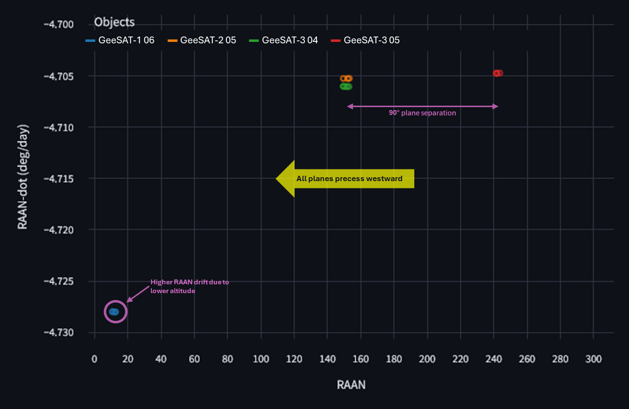 The RAAN precession rate plot above reveals the constellation's underlying structure through orbital mechanics. GeeSAT-1 satellites exhibit higher precession rates of 4.73° per day westward due to their lower and declining altitude. The newer satellites cluster around operational parameters, with 90° RAAN spacing between GeeSAT-2 and GeeSAT-3 planes, while GeeSAT-1 sits 129° away as of publication.