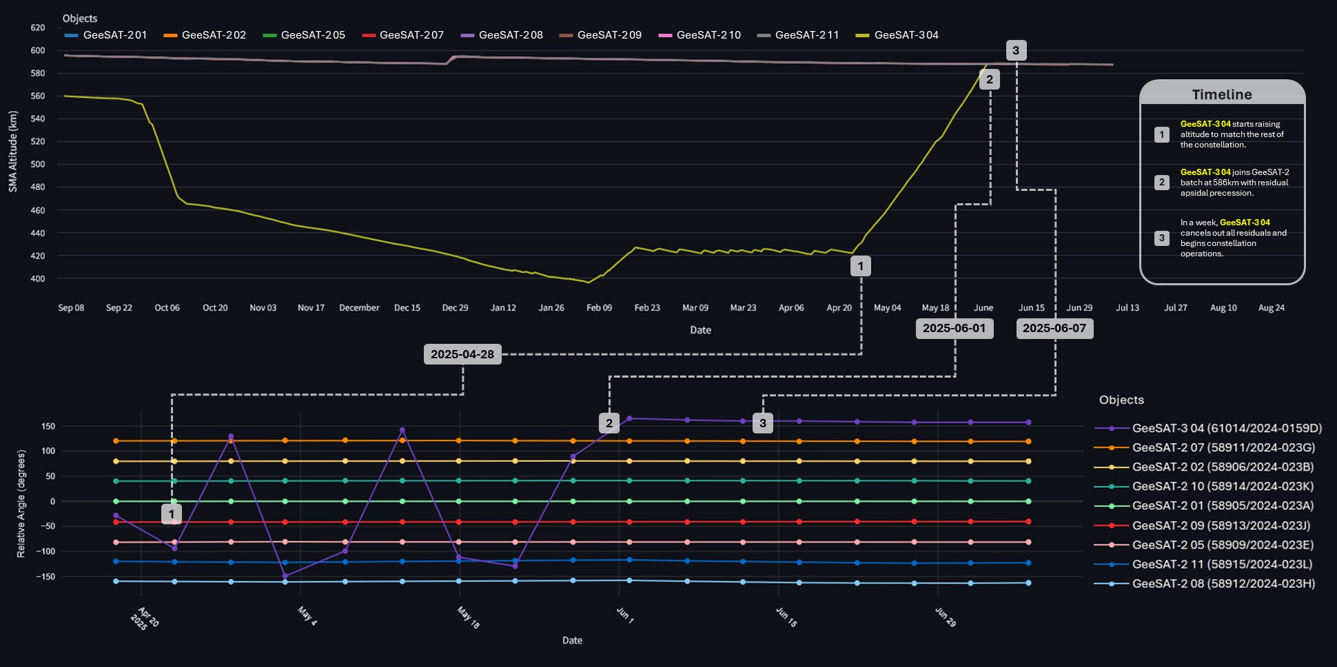 The composite graphic above shows the timeline of in-plane maneuvers executed by GeeSAT-3 04. Time-mark [1] indicates when operators began raising altitude with an almost daily thrusting schedule to reach approximately 587km. Mark [2] represents the final major burn, ending the satellite's 10-month journey. Within a week at mark [3], following calibrated argument of perigee phasing burns, GeeSAT-3 04 became the ninth operational member of the GeeSAT-2 plane, giving GeeSpace a set of 27 satellites ready to offer early operations for its parent company Geely's automotive services.